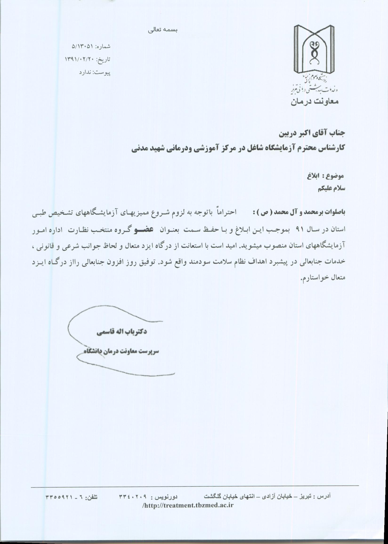 انتصاب آقای اکبر دربین بعنوان عضو گروه منتخب نظارت امور اداره آزمایشگاههای استان